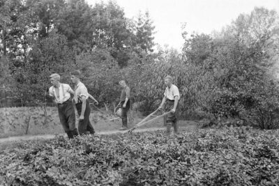 Gärtner Josef Jäger (Mitte) mit seinen Gehilfen beim Kartoffelanbau in der Nähe des Bispinghofes (ca. 1930)