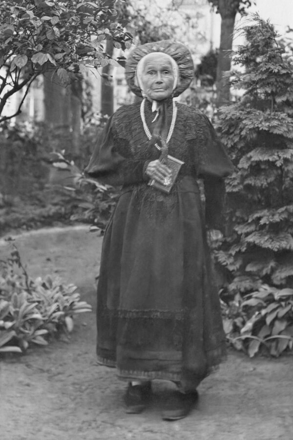 Charlotte Holländer (genannt Löttken) mit einer Kappe der Münsterländer Tracht (um 1900)